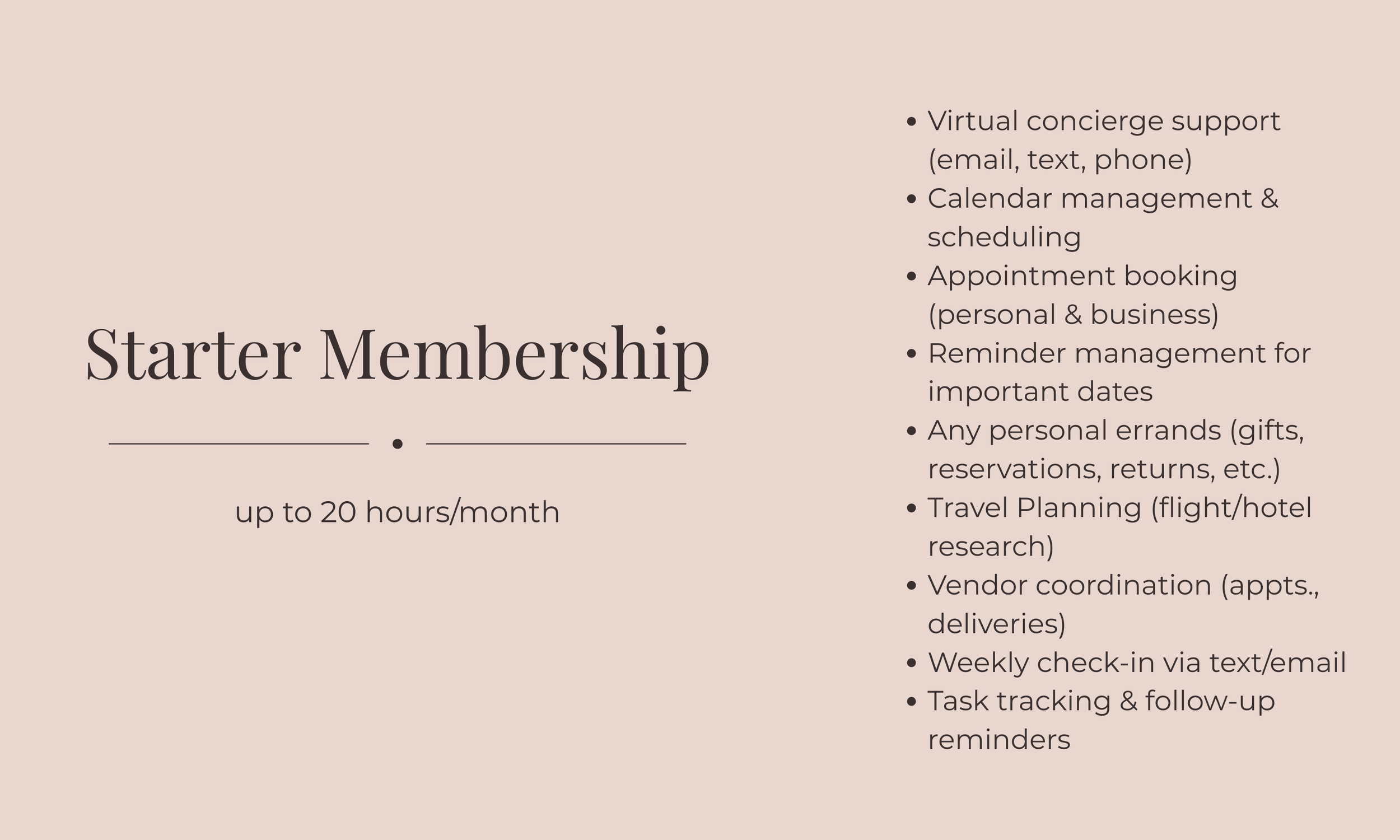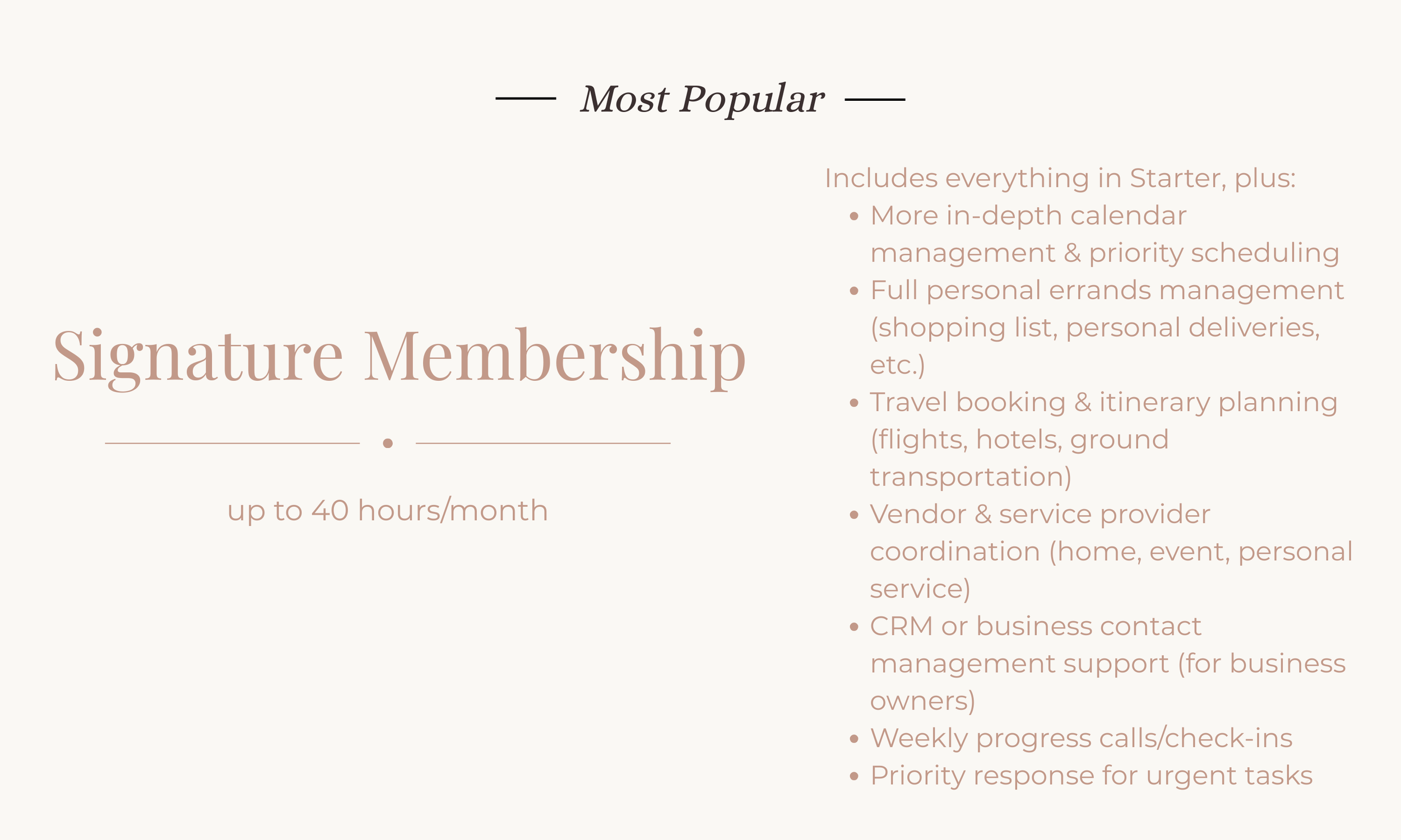 Membership‑based assistant support providing priority access, reliable scheduling, and dedicated help managing both business and personal responsibilities.